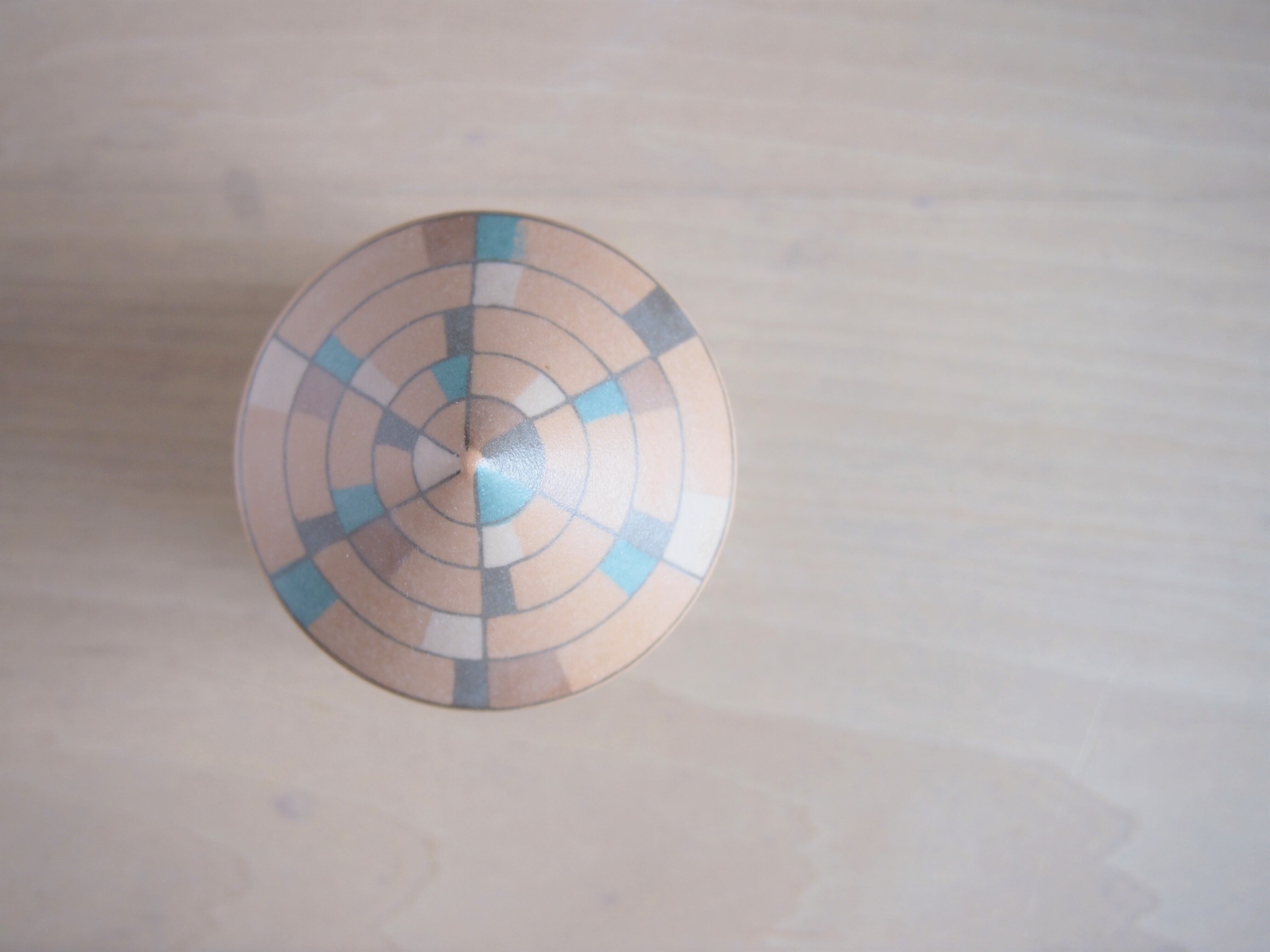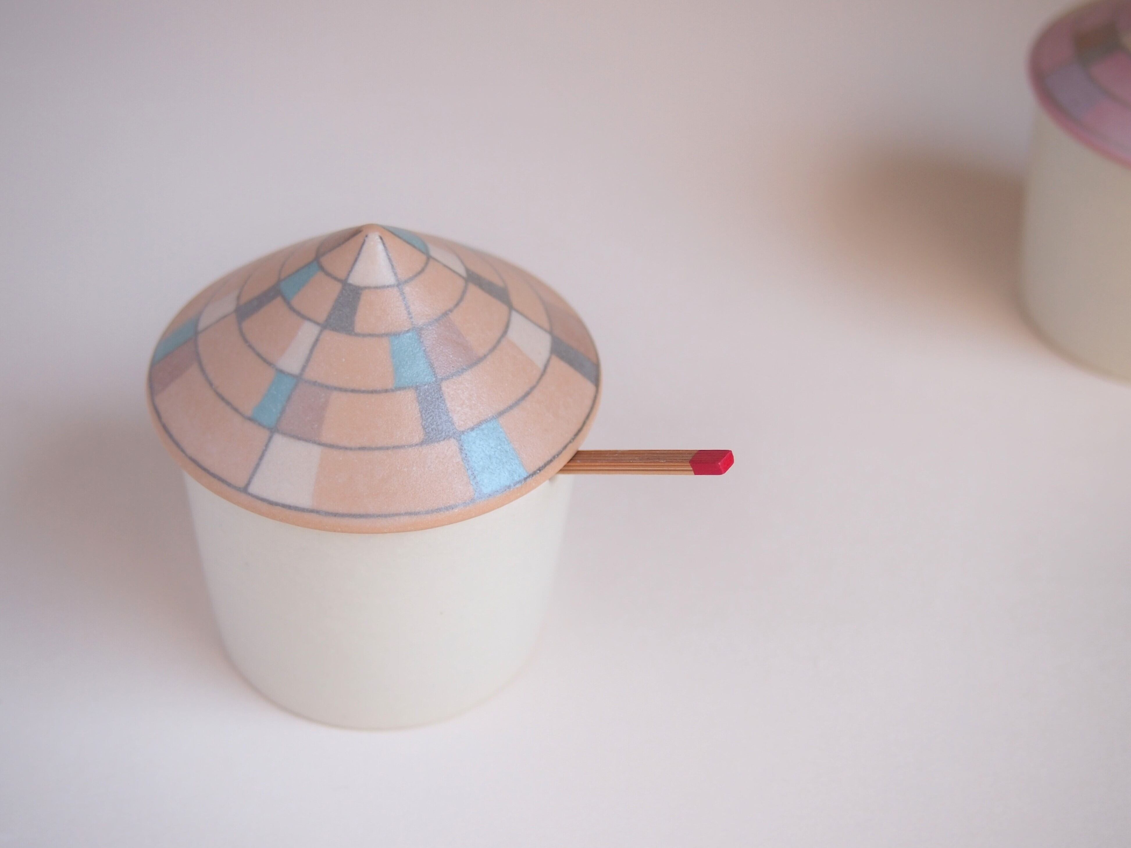 ・白地にマット系の釉/フタは、アプリコット色の色土に象嵌(ぞうがん)という技法で、模様を入れています。